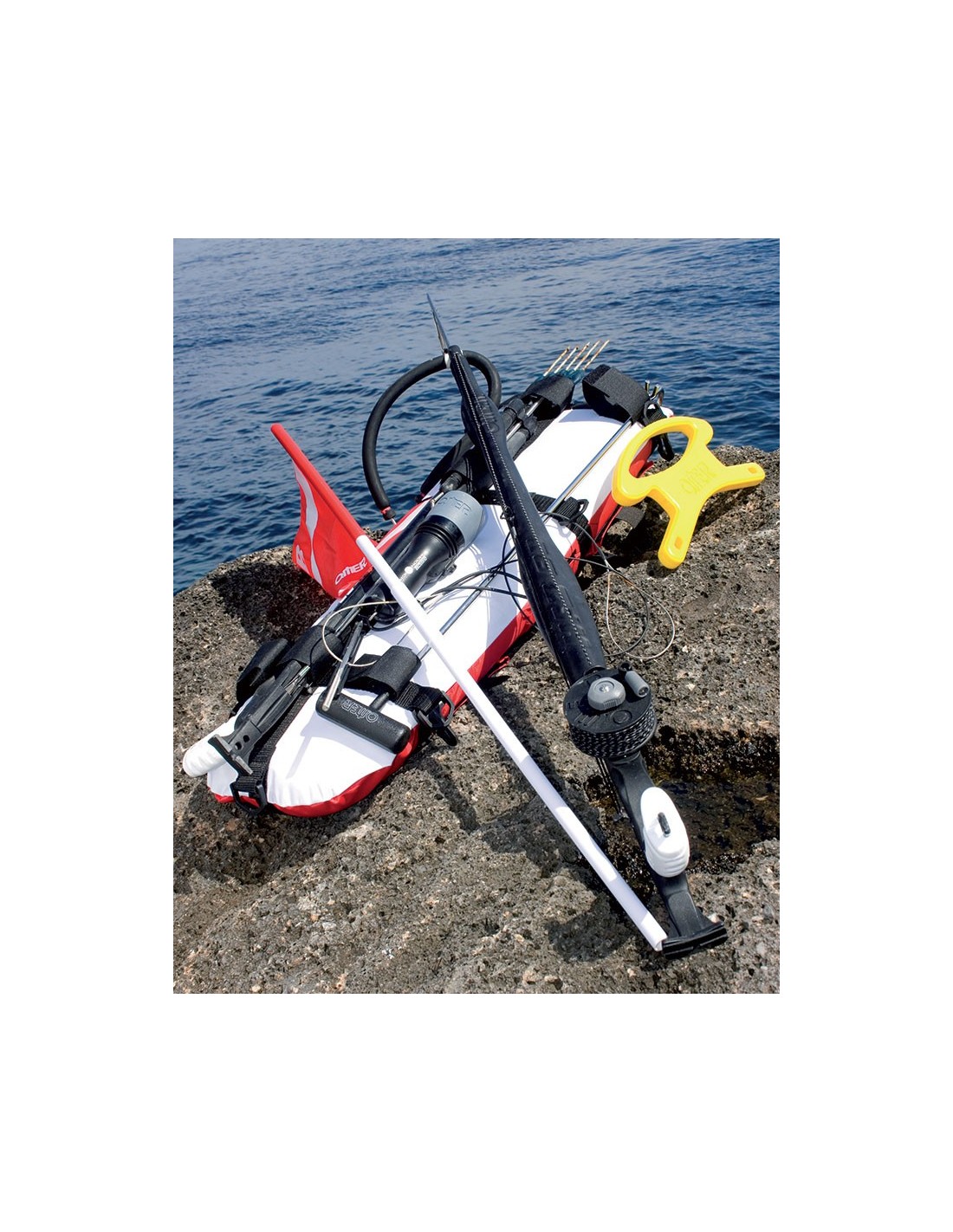 Die Boje ist mit einer Vielzahl von Karabiner, Schlaufen und Klettverschlushalterungen für die Befestigung von diversem Zubehör und Ersatzharpunen ausgestattet.