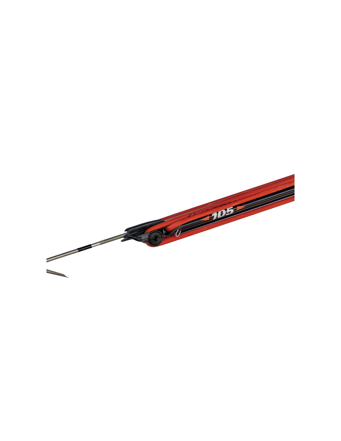 • Diese Harpune hat "Enclosed Track". Bei diesem System befindet sich der Pfeil in der Rille drin, so dass man den Pfeil mit der Monofilamentschnur nicht am Rohr befestigen muss (der Pfeil ist in der Rille fixiert). Die Monofilamentschnur wird dabei an den "shark fins" befestigt.