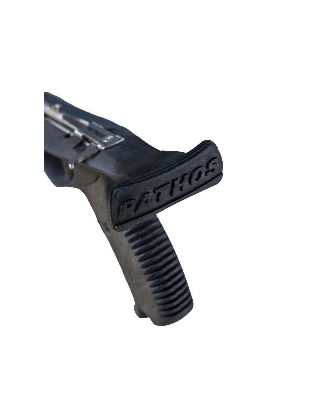 • Diese Harpune hat "Enclosed Track". Bei diesem System befindet sich der Pfeil in der Rille drin, so dass man den Pfeil mit der Monofilamentschnur nicht am Rohr befestigen muss (der Pfeil ist in der Rille fixiert). Die Monofilamentschnur wird dabei an den "shark fins" befestigt.