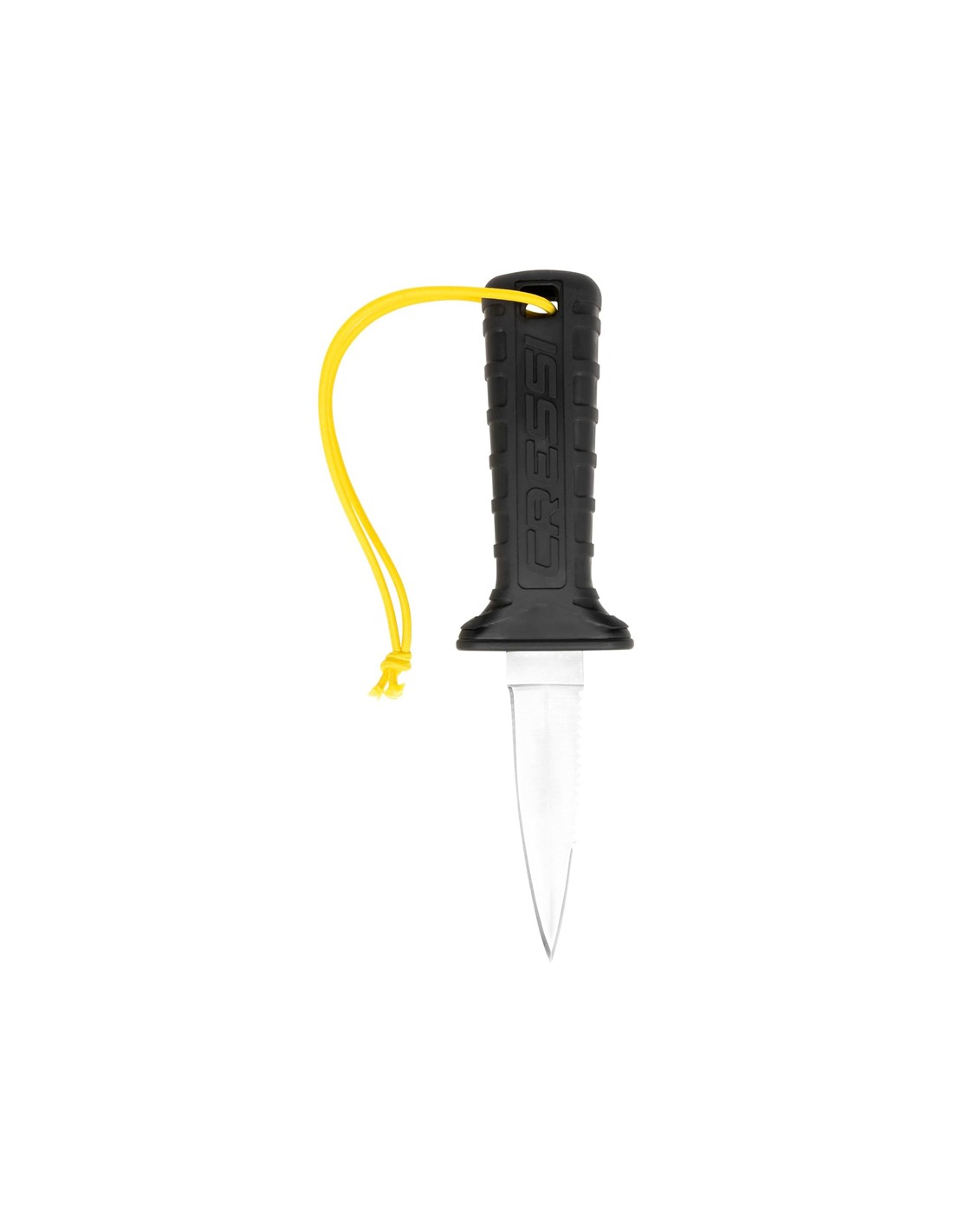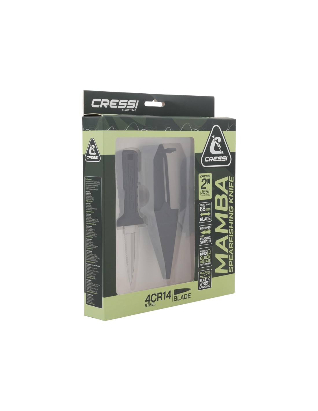 • The Cressi Mamba Knife is a reliable spear knife fitted with an elastic wrist lanyard and a rubber quick release ring. • 4CR14 Steel. • It can be mounted to a weight belt or arm. • Blade thickness: 3 mm. • Blade lenght: 68 mm. • Total lenght: 153 mm.